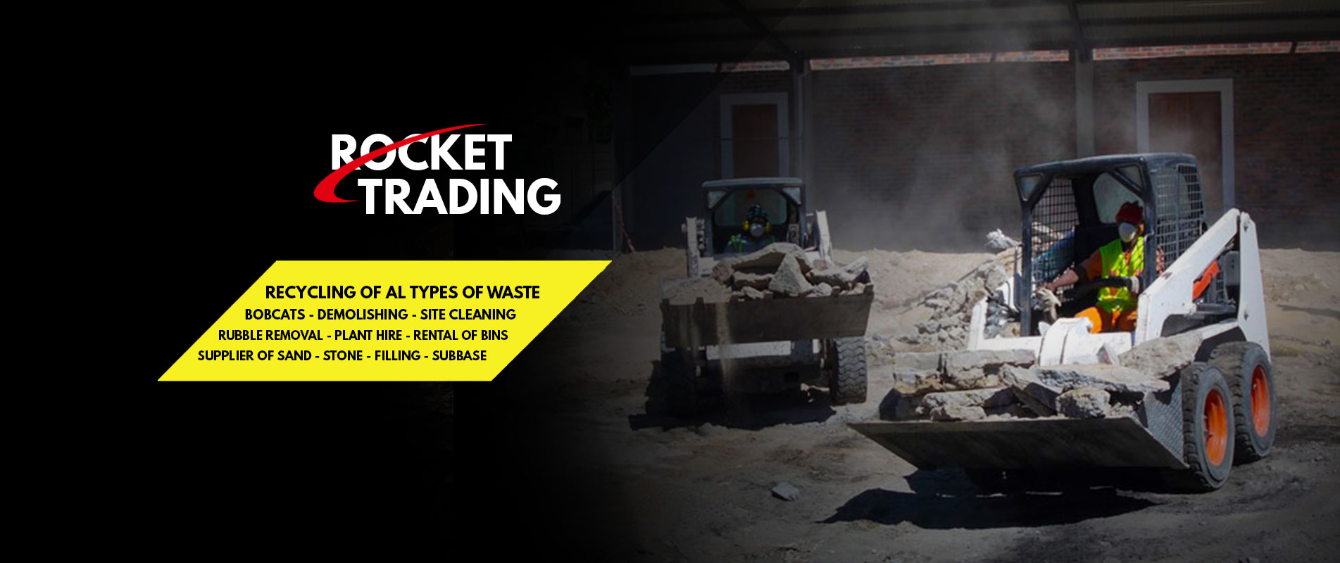 Rocket Trading 117 cc, is a leader in our chosen fields: Demolishing, Site Clearing, Rubble Removal with Labour, Bins, and V-Bins for hire, Building Sand and Stone, Bobcat Rentals, with Breaker, Hammer and Backhoe and Collection of scrap. Notice: JavaScript is required for this content.